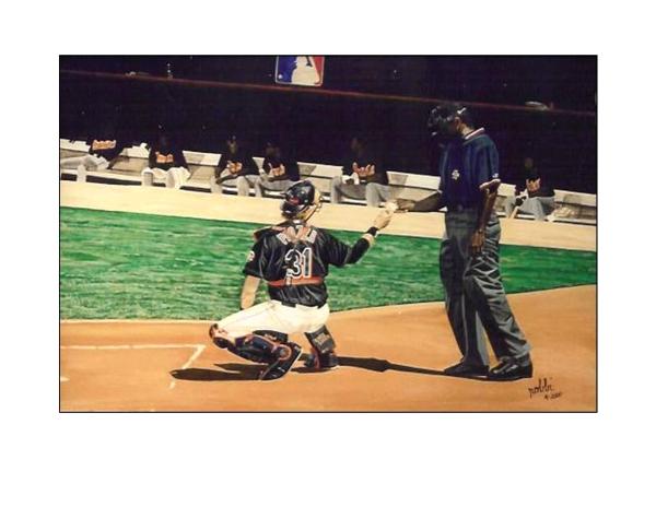 | mike piazza receiving a new ball from the umpire$5,000 2000, acrylic on canvas, 24" x 36"